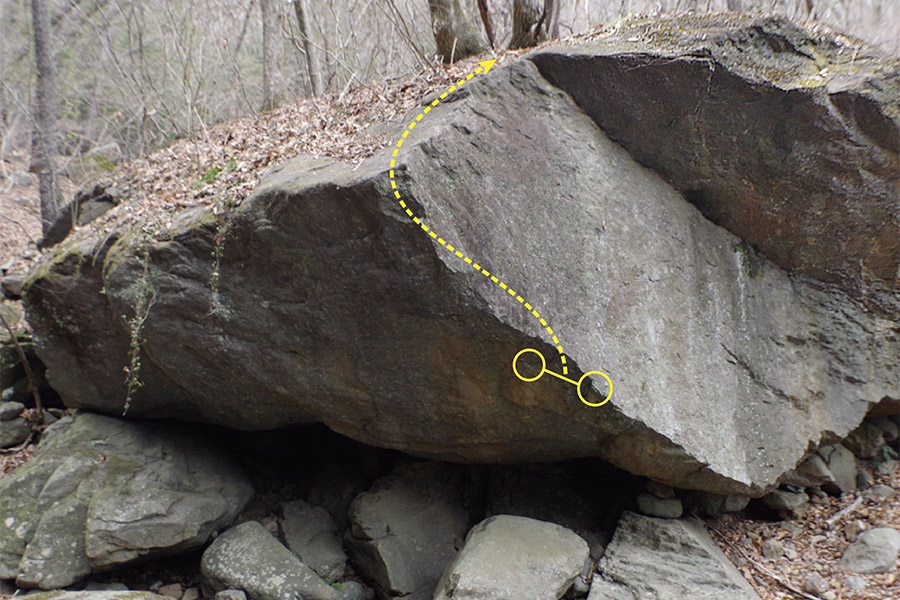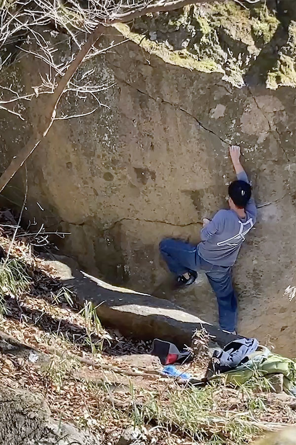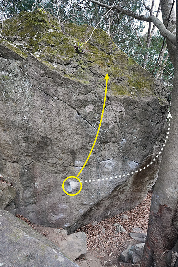 タイタンキラー(暫定グレード:二段) 初登者 :滝澤知誠(ちせい) 解説 : ガイドブックで (P81 #69)オープンプロジェクトとなっていた「ちんすこう岩」の直上ライン(設定者:片桐 大和)が2025年2月1日、滝澤 知誠(ちせい)によって登られた。 垂直からやや傾斜したフェースに散らばる非常に細かなホールドを繋ぐ内容で、「浮けるが進めない」厳しいムーブにこれまで誰も成功していなかった。 グレードに関して滝澤氏は「難し目の二段」とコメントしているが、それ以上の可能性もあり今後の再登者の意見を待ちたい。(2025年4月に室井登喜男氏が再登。グレードについては二段とコメントした。)