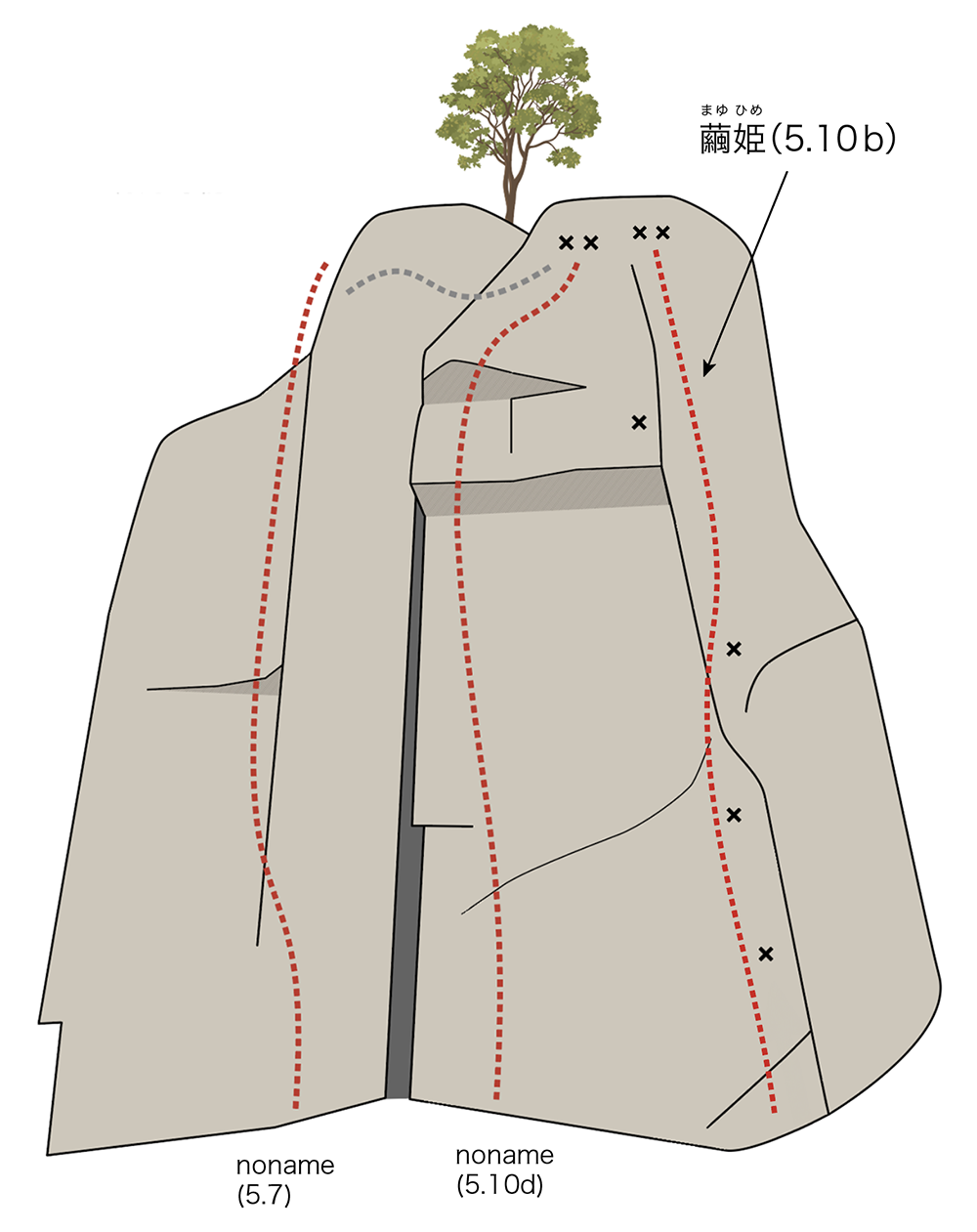 エリア : 大手門2階エリアF(右端) ① 繭姫(5.10b) 初登者 : 西川まゆみ 解説 : 2025年2月7日に公開した情報では開拓試登中としていたライン。 カンテに沿って登る非常にスッキリしたライン取りで、特にバランシーな出だしが難しい。 グレードは5.9との情報をいただいたが、複数の再登者の意見からここでは5.10bとしている。 ② 翡翠姫(5.9) 設定者 : 西川まゆみ 解説 : 繭姫のある岩から右奥に続くきれいなスラブで、顕著なカンテと浅い凹角を縫うように登る。 出だしは目立つホールドもなく迷うかもしれない。カンテをつかんでからは幾分バランスが取りやすくなり、最後は右面に移ってトップアウトする。 上部左面にもボルトが1本設置されており、終始カンテの左側を登るバリエーションもある。(ロープの流れが悪くなるので、オリジナルラインを登る際はこのボルトにクリップしないように。) グレードはオリジナルライン、左のバリエーションライン共に5.9。幾分左が難しいようだ。 |